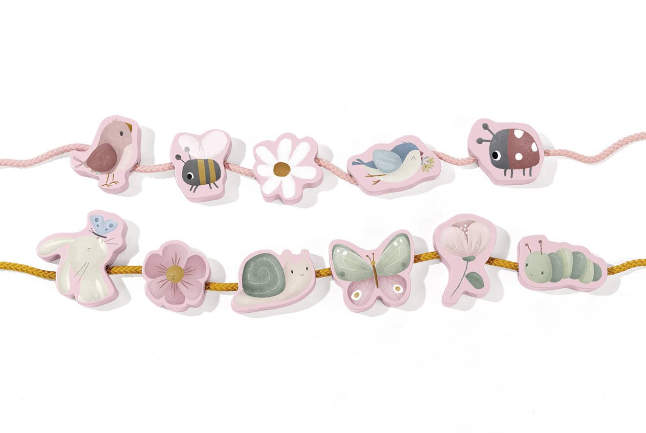 O conjunto inclui 12 contas de madeira ilustradas com os personagens e elementos florais da coleção, além de um cordão com pontas rígidas, fácil de usar por mãos pequenas.
