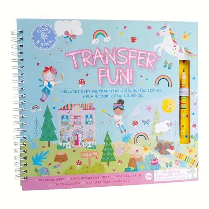 Os Transfers vêm com mais de 150 transferências temáticas brilhantes, 6 cenas coloridas para colocá-las, 6 páginas em branco para fazer desenhos e um lápis Floss & Rock.